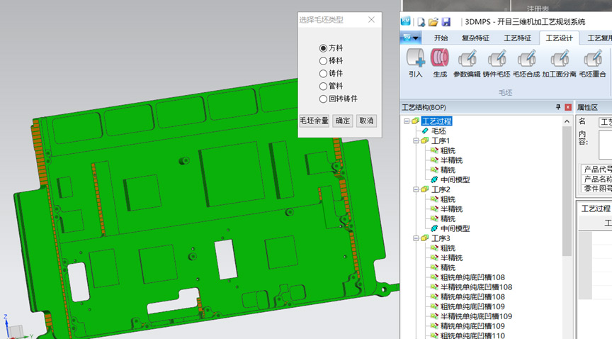 3DMPS是基于MBD技术,通过识别3D数模的制造特征及尺寸信息、公差和精糙度等信息,基于专家知识库智能推理,自动获取各制造特征的加工方法,生成零件的加工工艺过程、毛坯模型及各工序的中间模型,并支持加工过程仿真,工艺人员更准确、更高效地完成加工工艺设计,从而缩短生产准备周期,提高产品质量,降低研发成本,提高市场竞争力。