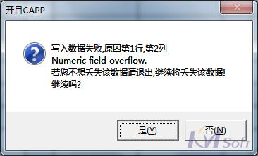 在KMCAPP网格中导入EXCEL表格数据时,报错“写入数据失败,原因第1行,第2列Numeric fieldoverflow.若您不想丢失该数据请退出,继续将丢失该数据。继续吗?”如图