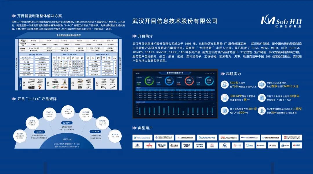 开目软件的方案和产品已广泛应用于航空、航天、航发、电科、船舶等军工集团,以及以中国铁建、中国中车、特变电工、徐工集团、太原重工等为代表的诸多中国500强高端装备制造企业,高端客户数市场占有率名列前茅。