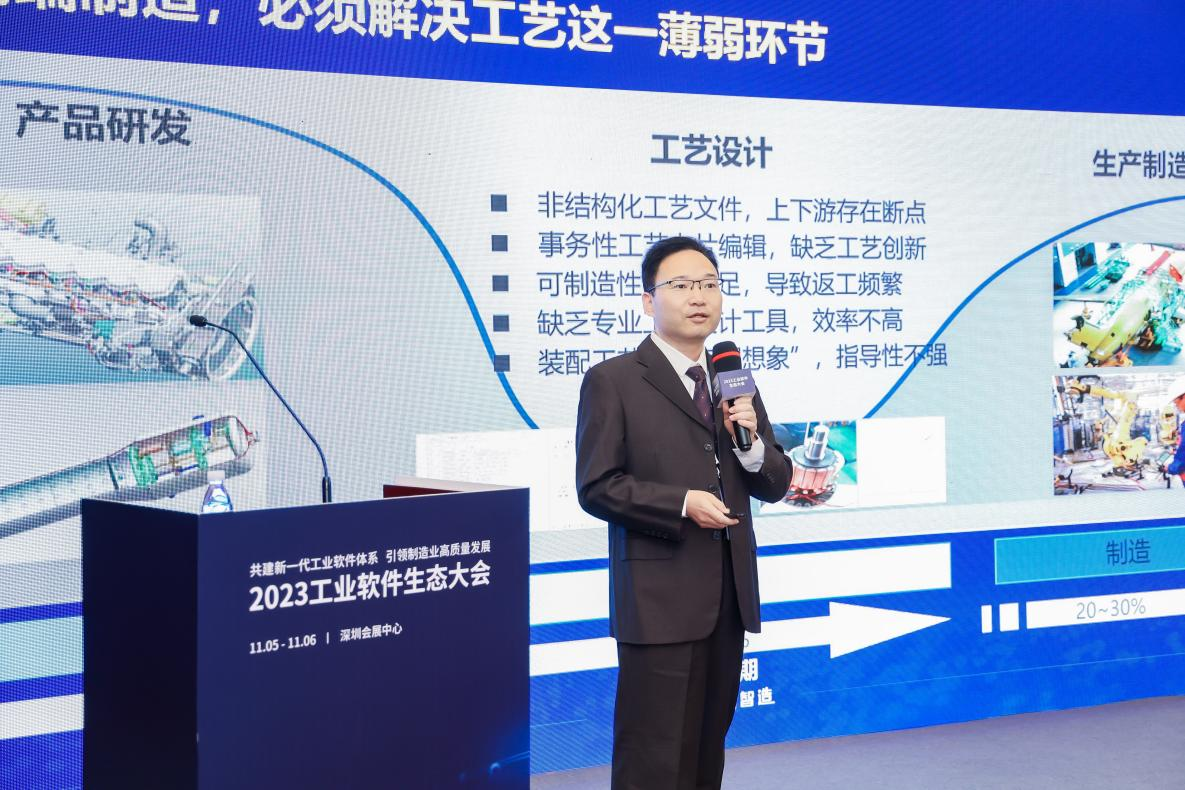 开目软件深圳子公司常务副总经理詹红斌受邀发表《模型驱动,创新智造-开目新一代数字化工艺解决方案》主题演讲。詹总指出,高端制造,必须解决工艺这一薄弱环节??炕谀P偷氖只ひ战饩龇桨?,通过新一代工业软件架构,建立统一数据源,打通设计BOM、工艺BOM、制造BOM数据流,帮助企业构建全流程、全要素、全协同的结构化工艺管理体系,实现工艺数据的有序流动和高效利用,提升工艺精细化管理水平。