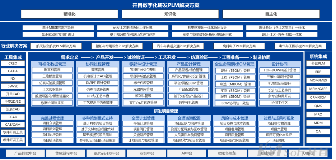 KMPLM CLOUD是由武汉开目信息技术股份有限公司自主研发的云原生、微服务、国产自主可控的新一代PLM系统,能为企业构建从研发到制造的端到端的数字主线,支持产品全生命周期的数字化管理和协同,推动快速响应用户需求的全价值链的变革,帮助企业实施研发数字化转型,从而达到提升研发效率和质量,促进创新和持续提升竞争力的战略目标。