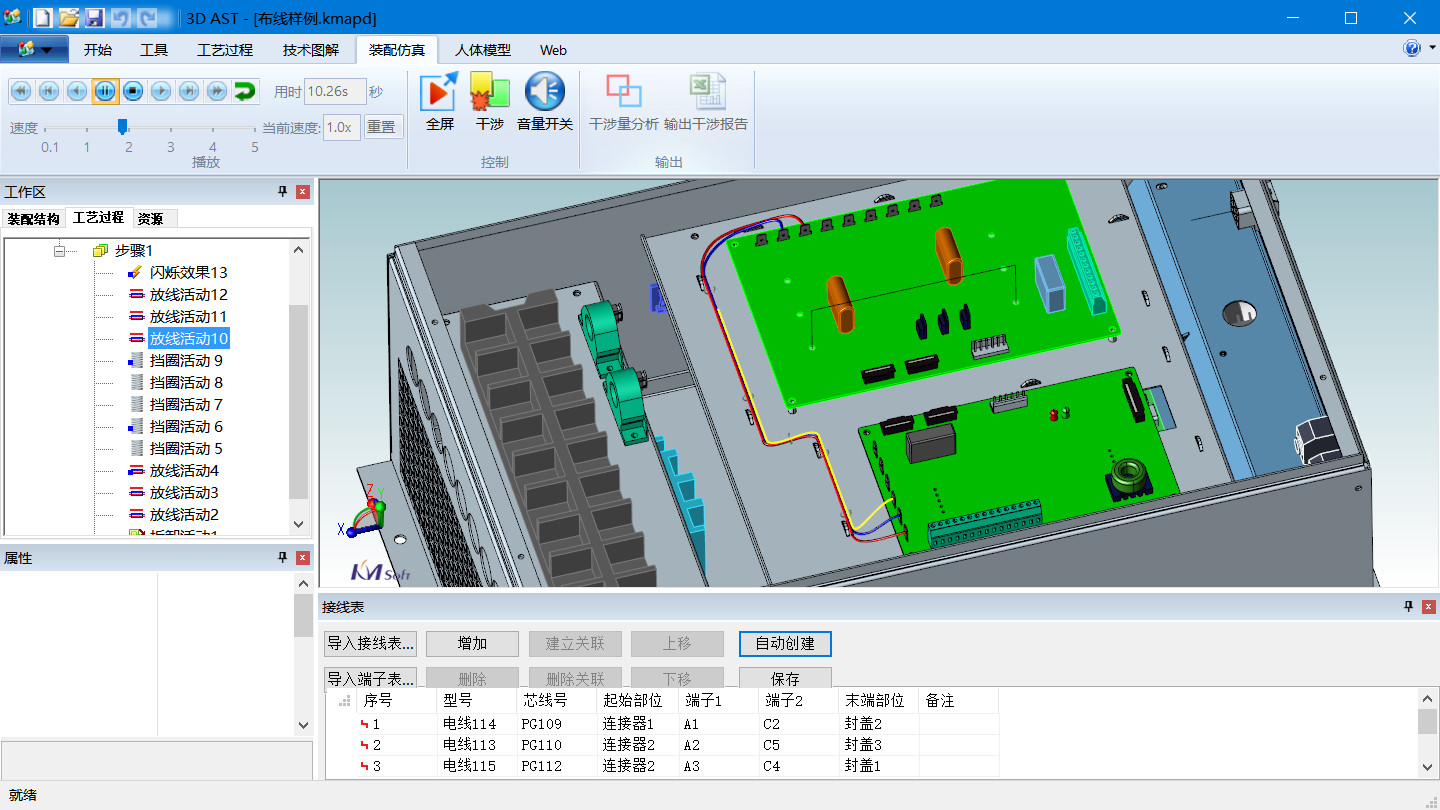3DAST三维布线功能可实现电装产品中的线缆设计,支持定义线缆走线路径,并根据指定线缆规格生成线缆实体从而完成三维布线。针对设计的线缆可以进行工序规划,并定义放线活动,实现线缆的敷设仿真。