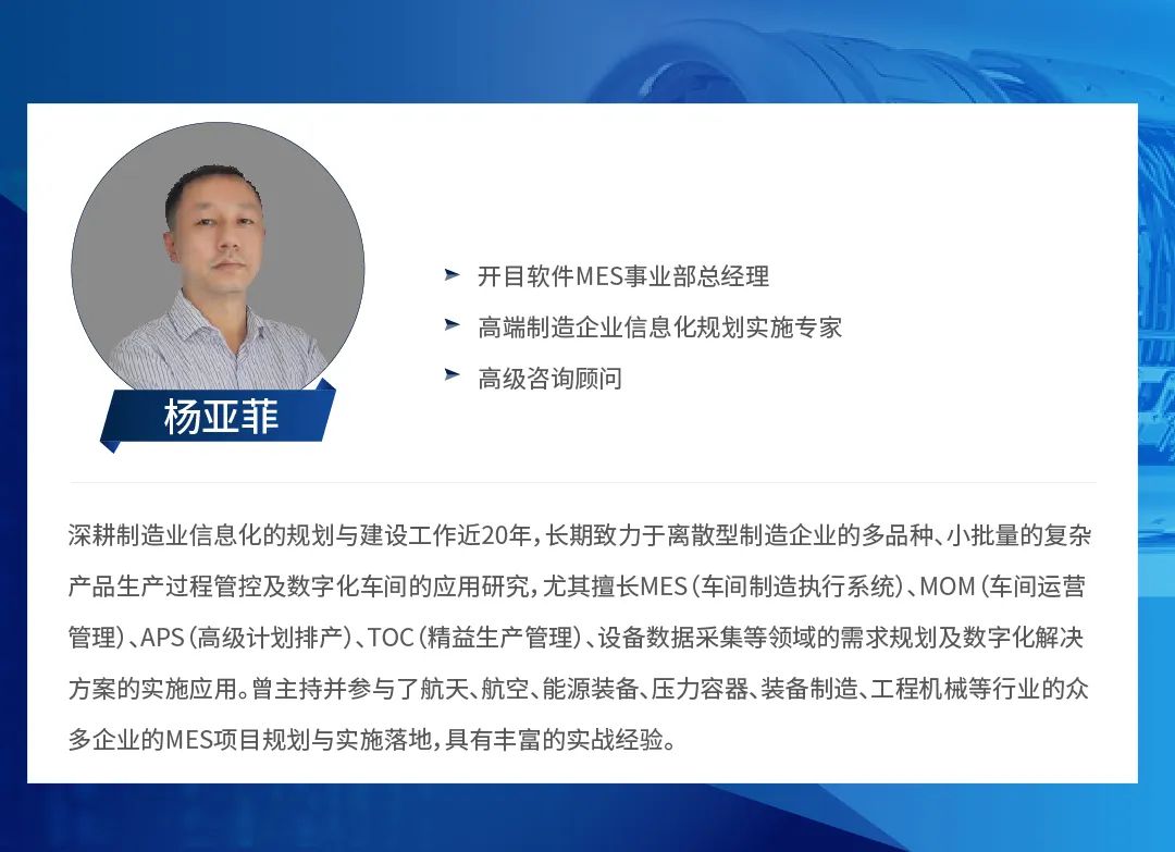 本期研讨会特邀开目公司MES事业部总经理杨亚菲、四机赛瓦生产总监黄志军、广日电梯信息中心副主任付东军做客开目线上直播间,专家将全程在线答疑,与来宾深入探讨开目制造执行系统MES的优势特点与实际落地应用。