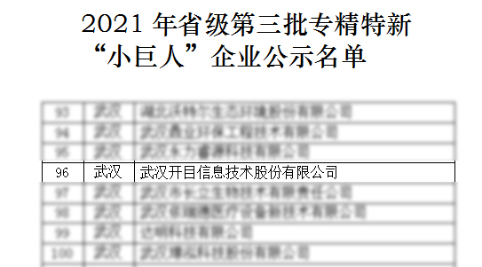 近日,湖北省经济和信息化厅公布了2021年度省级专精特新“小巨人”企业名单,武汉开目信息技术股份有限公司成功入选。