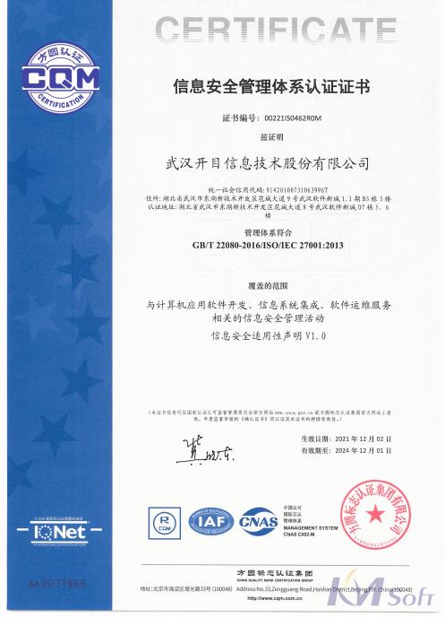 ISO27001认证标准是全球公认的最权威、最严格,也是被广泛接受和应用的信息安全领域的体系认证标准。开目软件作为国内工业软件领域具备完全自主知识产权的信息技术企业,深谙信息安全管理体系是维护企业信息安全、增强企业核心竞争力、提高客户满意度的强有力保障。