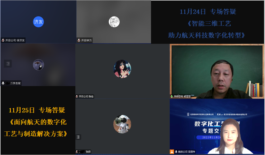 11月24-25日,开目软件联合北京航标时代检测认证有限公司举办的航天科技“数字化工艺转型”2场专题交流会圆满落幕??抗?D事业部、MES事业部、咨询顾问部的专家领导与开目航天科技的典型用户:五院、九院的数字化工艺专家,共同就数字航天的工艺与制造技术展开深入交流和研讨,航天科技集团旗下50+所属单位,约150余名数字化、信息化领导,工艺师等线上参会,反响热烈。