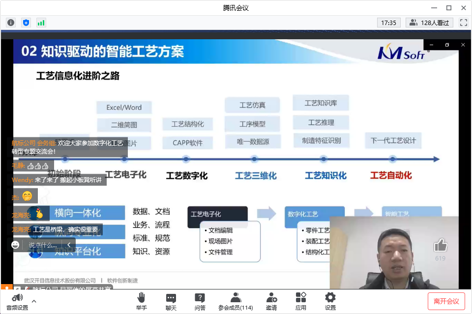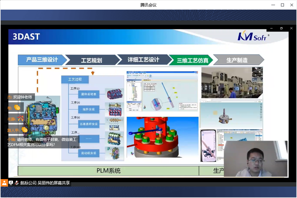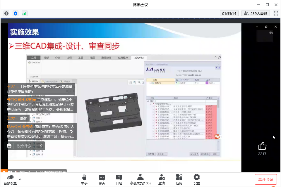 连线研讨环节,参会代表积极参与,踊跃互动:工艺的规划和审查规则是基于什么标准制定,是否支持用户自定义呢?DFM能否审查二维图纸,二维与三维的尺寸标注如何进行审查?开目3DAST模型轻量化能对模型优化多少比例,轻量化转换后会不会存在模型数据丢失或信息缺失?3DMPS中工艺路线如何生成?如何实现工艺快速变更呢?工艺流程图如何形成?三维工艺下车间如何实现?工艺制造一体化如何实现?······