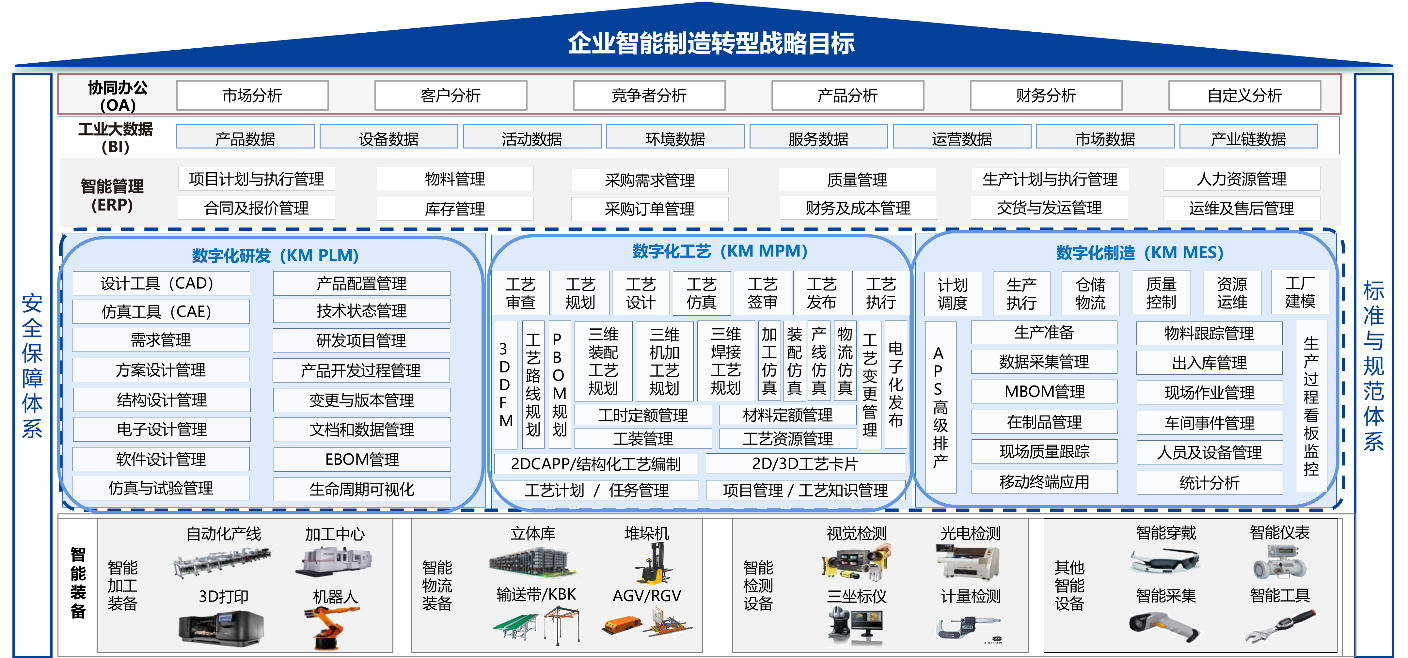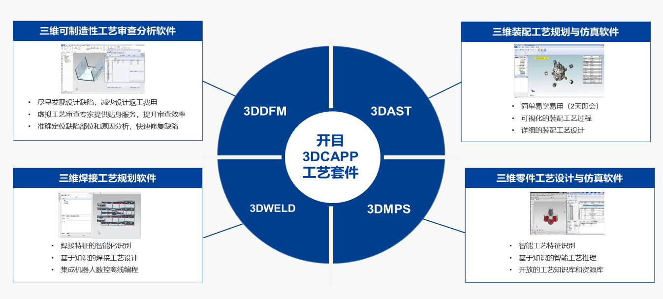 时至今日,开目公司已形成了完整的智能制造解决方案及高端工业软件产品体系,包含KMPLM、KMMPM、KMMOM等一系列覆盖产品研发、工艺设计、生产制造的一体化管理平台以及以KMCAD、KMCAPP、KM3DDFM、KM3DAST、KM3DMPS、KM3DWELD、KM3DVIEWER为代表的研发设计类工具软件产品,全方位助力中国制造企业向“中国智造”迈进。