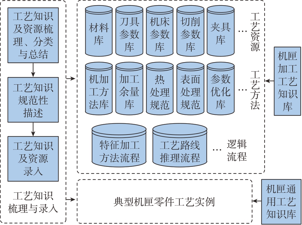 机匣零件工艺知识库包括加工工艺知识库、通用工艺知识库。加工工艺知识库,主要分为工艺资源、工艺方法、工艺推理逻辑流程三大类。其中工艺资源为工艺基础数据,包括材料库、刀具库、设备库、切削参数库等;工艺方法包括机加工工艺方法、加工余量、热处理规范等;工艺推理逻辑流程用于对特征加工方法以及机匣零件工艺路线推理的逻辑判断。通用工艺知识库,包括典型机匣零件的工艺实例,将典型机匣零件的工艺实例以结构化数据进行录入,供相似零件进行工艺复用,提高工艺设计效率与工艺质量?;涣慵ひ罩犊饪蚣苋缤? 所示。