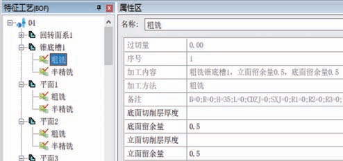 针对机匣类型零件,定义一套加工知识库,基于识别的特征的几何信息与制造信息进行加工方法推理,推理出特征的加工步骤以及余量。如机匣中的锥底槽特征经过知识库的推理得出的加工步骤为“粗铣—半精铣”,且粗铣的底面与立面的余量为0.5 mm,如图4所示。