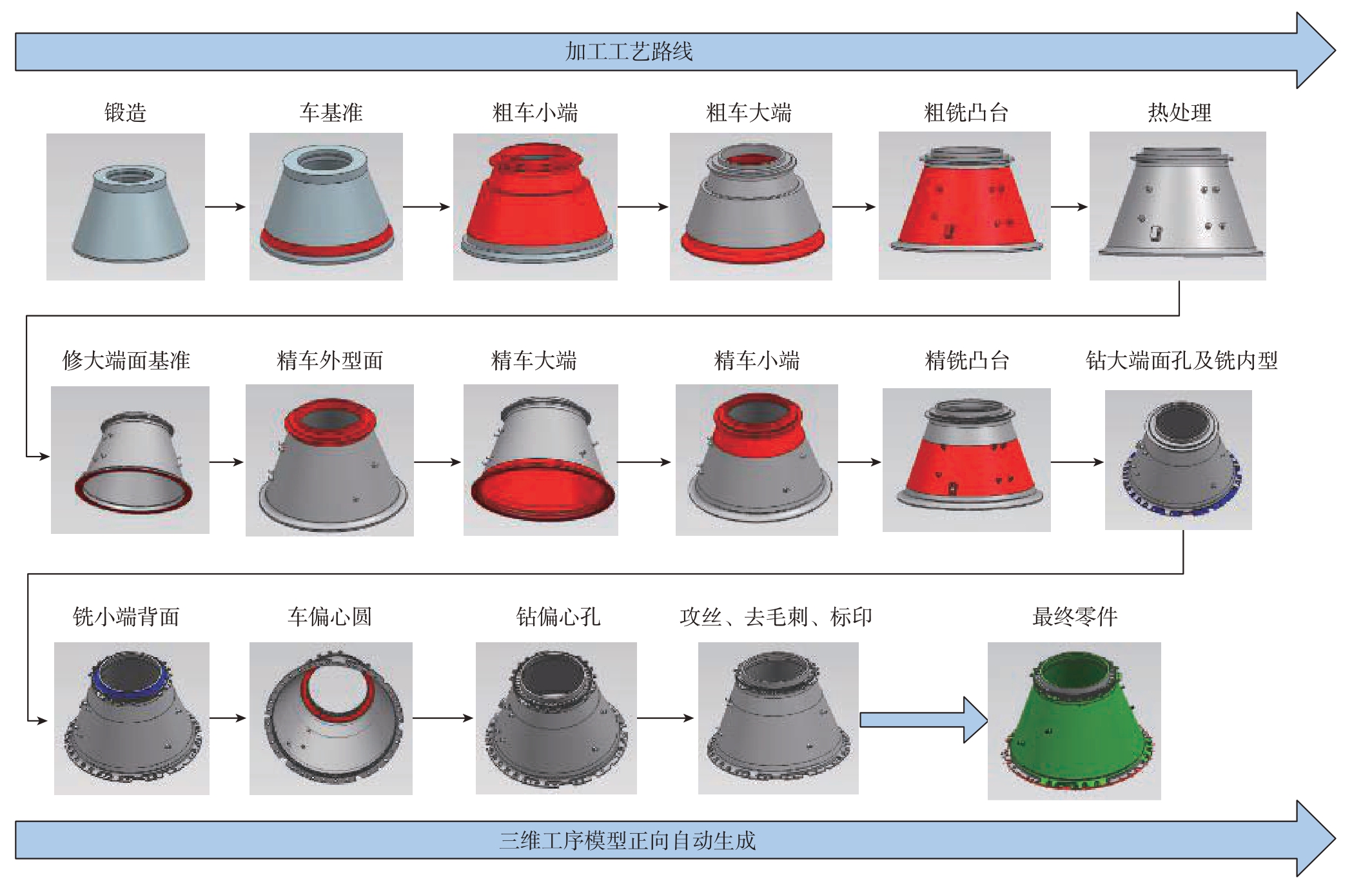 (2)通过工艺推理获得特征的加工步骤与余量,然后根据典型机匣工艺模板确定机匣零件工艺路线,自动构建三维工艺模型,典型机匣零件加工过程如图12 所示。