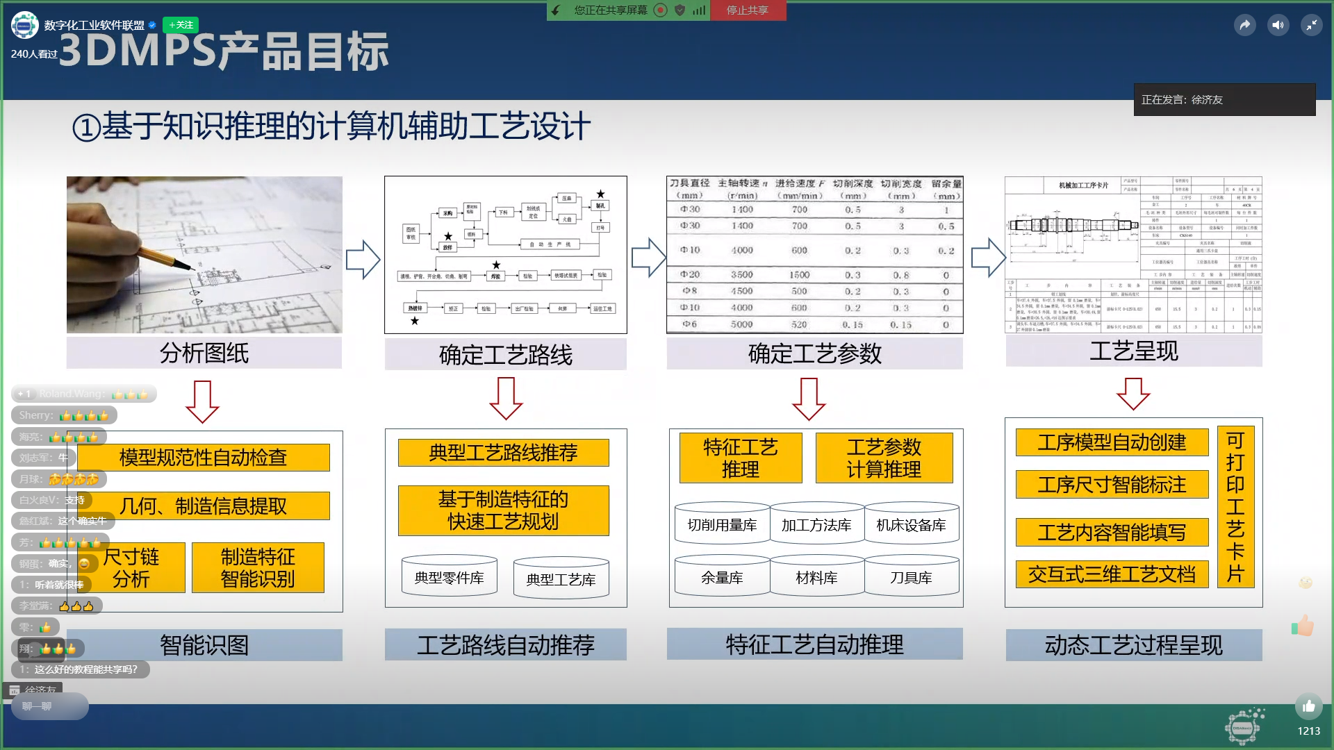 本次直播活动,由开目3D事业部总经理徐济友主讲。徐总从制造业企业工艺设计需求痛点切入,针对传统工艺设计技术手段缺乏,三维数模利用不足、工艺设计周期长等问题,提出模型驱动的智能零件工艺设计方案产品3DMPS,从研究目标、产品特点、工艺设计流程、关键技术研究等方面进行了讲解,并重点分享了开目3DMPS在汽车发动机缸体零件、某航天零件、某叶轮零件等应用实践,引起了在线观众的热烈反响,纷纷表示受益匪浅。