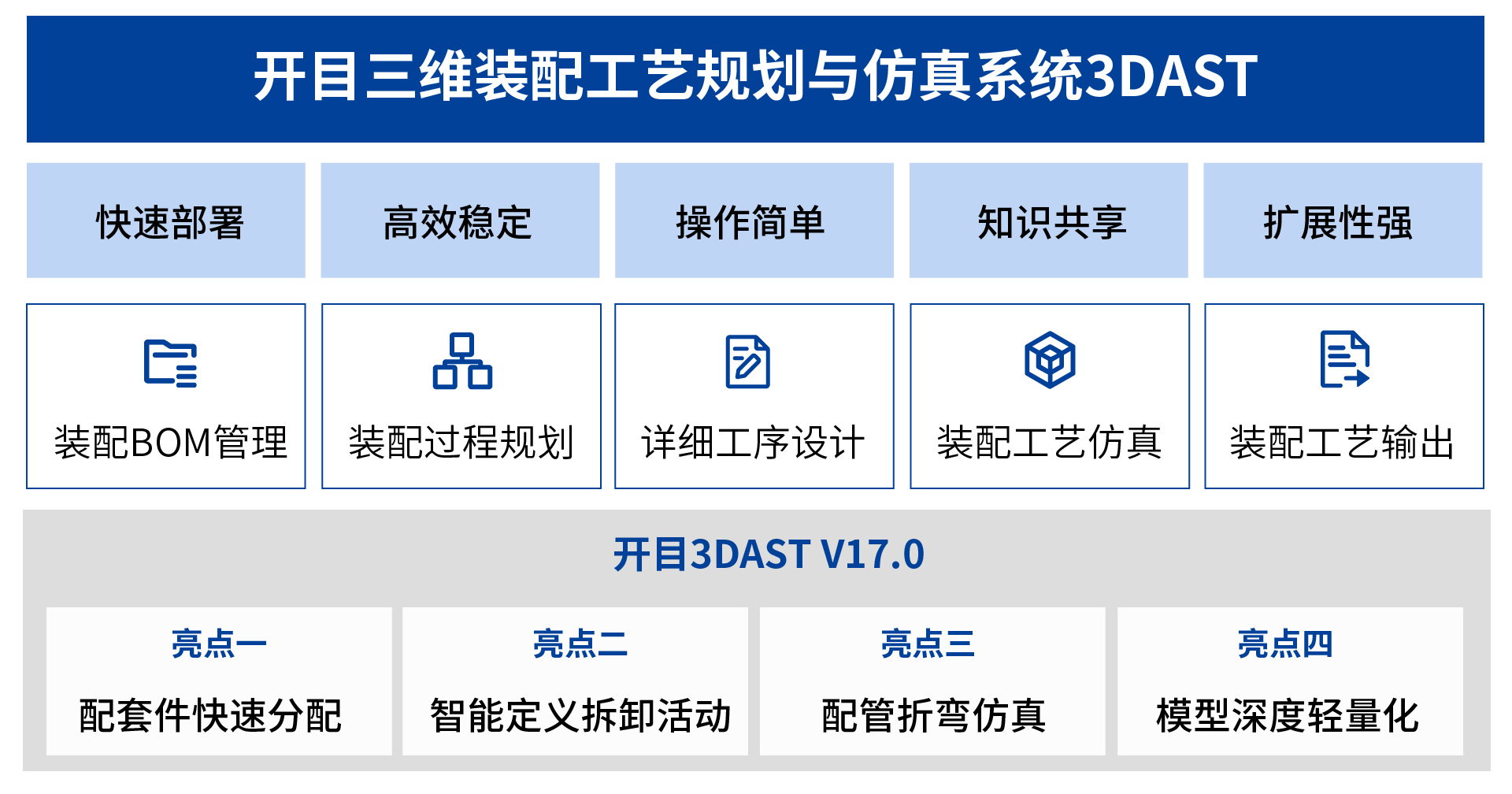 随着制造企业数字化转型、智能化升级的深入推进,在装配工艺设计过程中,高端制造用户对工艺路径智能推荐、复杂空间拓扑结构中大型装配体的工艺规划、大模型文件深度轻量化、软件易用性等方面提出了新需求。为此,开目软件以用户需求为导向,凭借深厚的技术积累,重磅推出3DAST 17.0新版本,亮点颇多。