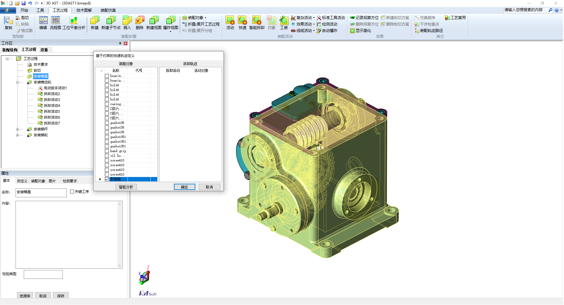 结合经典图形算法及数据结构,开目3DAST研发团队开发出基于约束的快速定义拆卸活动功能。针对工序进行拆卸活动时,对工序的对象进行空间位置与接触关系的分析,自动推荐该工序零部件的拆卸顺序与运动轨迹。如在减速器箱盖的装配规划中,通过智能拆卸功能可以将轴承盖、箱盖及各紧固件进行快速规划,整体操作效率提升20%以上。