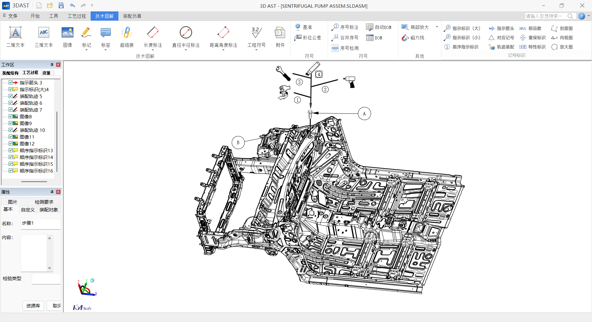 3DAST 18.0利用先进的三维可视化技术,将白车身总装工艺以生动、直观的三维图解形式呈现。用户可在软件中对三维白车身模型进行全方位浏览、拆解与标注,自由添加总装记号、图识等工艺信息,还支持动态展示装配流程与关键技术要点,将复杂的白车身总装工艺转化为直观易懂的可视化数字资产。