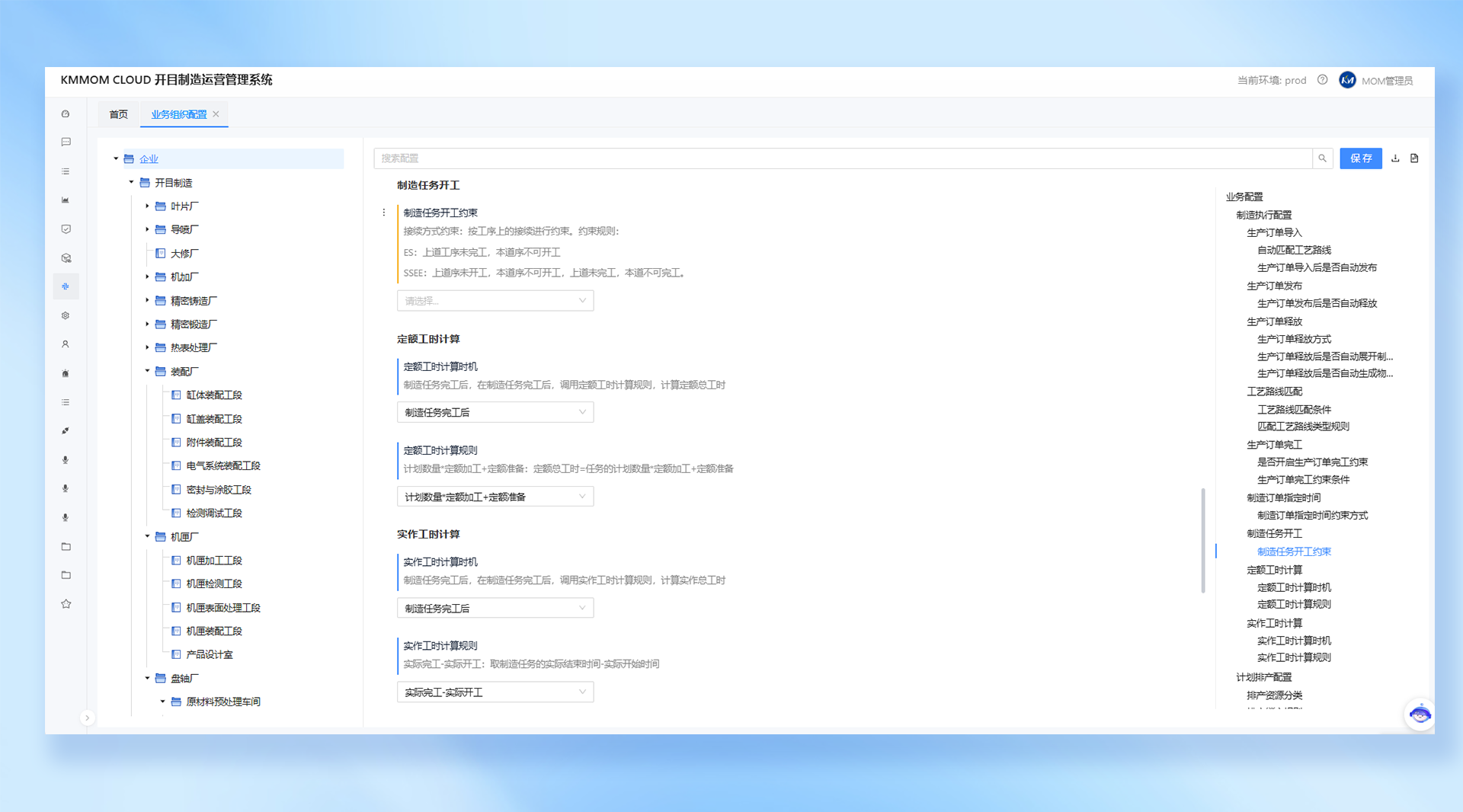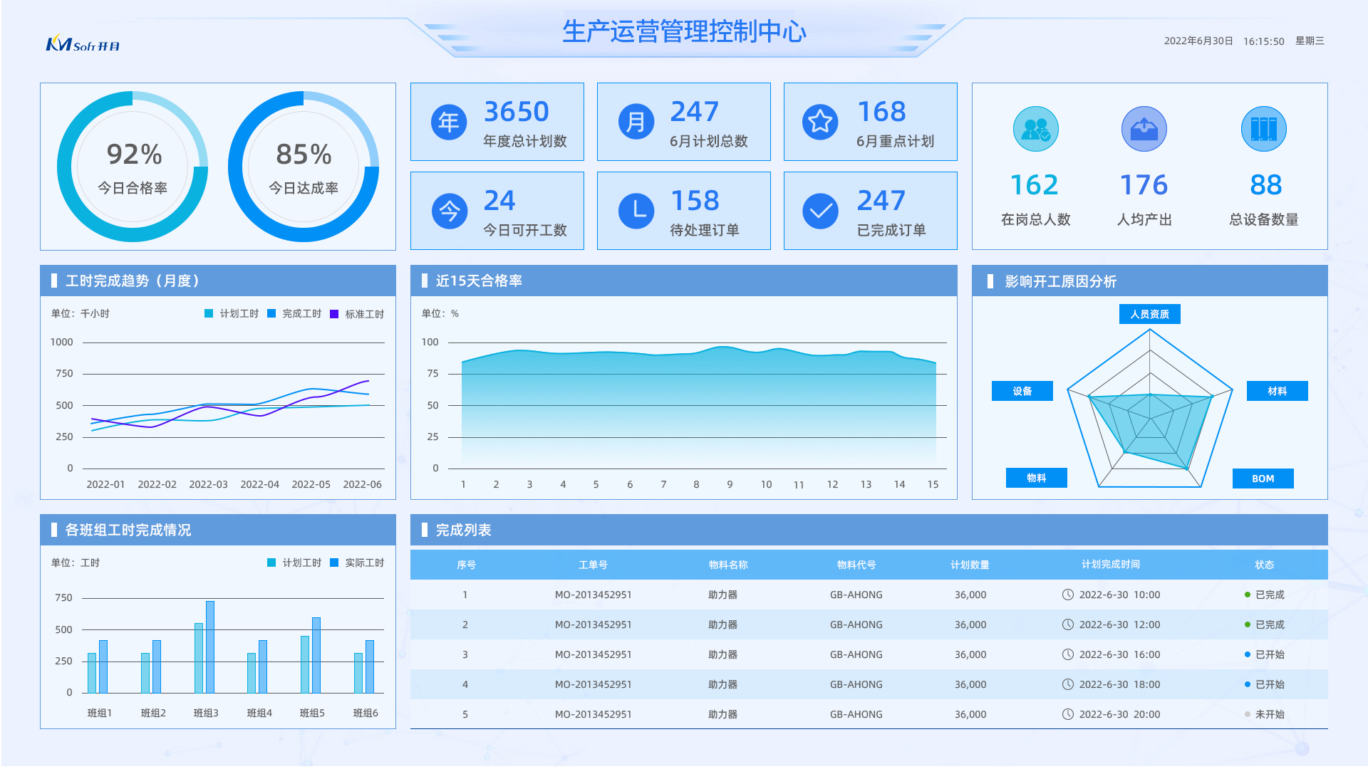 KMMOM CLOUD V3.0涵盖生产管理、计划排程、制造执行、仓储管理、质量管理、工时管理、设备管理、工装管理、外委管理等核心功能,实现高端制造从订单-计划-生产交付的全链路数据穿透与端到端智能闭环管理,提升企业制造运营效率与产品交付能力。