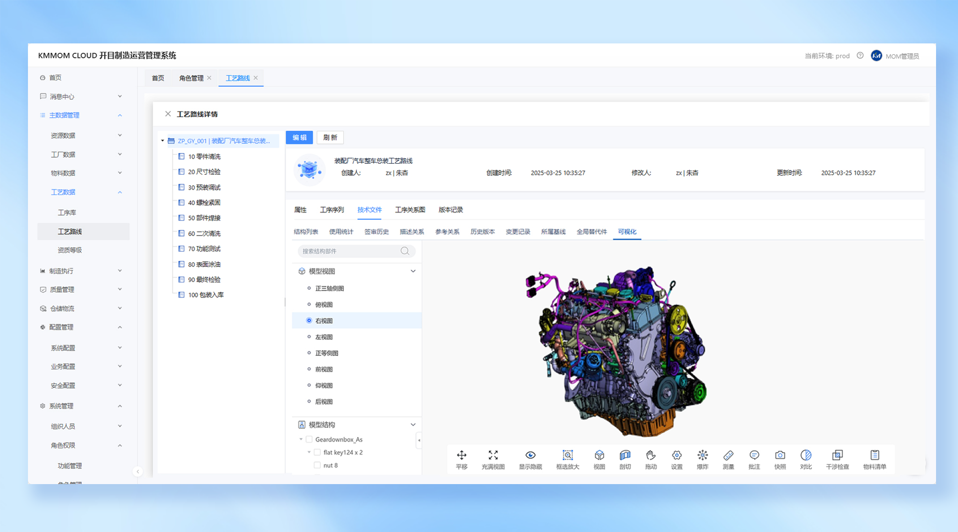 目前,KMMOM CLOUD V3.0已在某高端装备制造企业成功落地实施,实现了从顶层ERP系统(园区网)到底层产线系统(工控网)的无缝连接,确保了系统的互联互通;同时,CAPP、ERP、MOM等关键系统也完成了国产化替代和重构。该系统实现了制造业务域模型的规范化,涵盖了物料、BOM、工艺、工装、设备、计划、转工、工卡、工时、维修大纲等多个方面,覆盖了从零件毛坯制造、热处理、零件加工到发动机修理装配等多个专业领域和多个工厂的生产管理及协同工作,实现了从企业级计划能力分析到工序级任务调度管理的自制全流程管控。