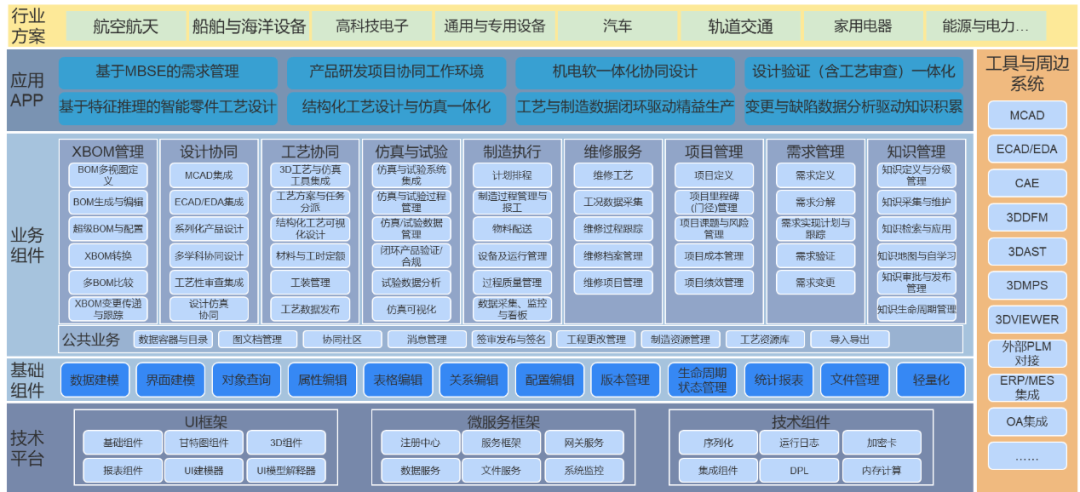 基于这些“核”动力,KMPLM CLOUD可建构数字化研发、数字化工艺、数字化制造等应用场景的典型应用APP,包括基于MBSE的需求管理、产品研发项目协同工作环境、机电软一体化协同设计、设计验证(含工艺审查)一体化、基于特征推理的智能零件工艺设计、结构化工艺设计与仿真一体化、工艺与制造数据闭环驱动精益生产、变更与缺陷数据分析驱动知识积累等。
