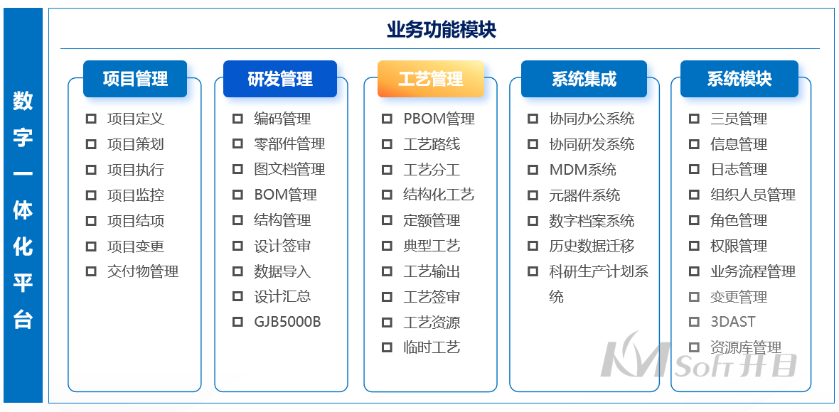 这一高效变革的核心,是开目软件为该研究所量身打造的产品数据资源管理及设计工艺数字化平台 ——以开目PLM为核心,串联多CAD 工具、多业务系统,覆盖研发、工艺、生产全流程的全链路数字中枢。